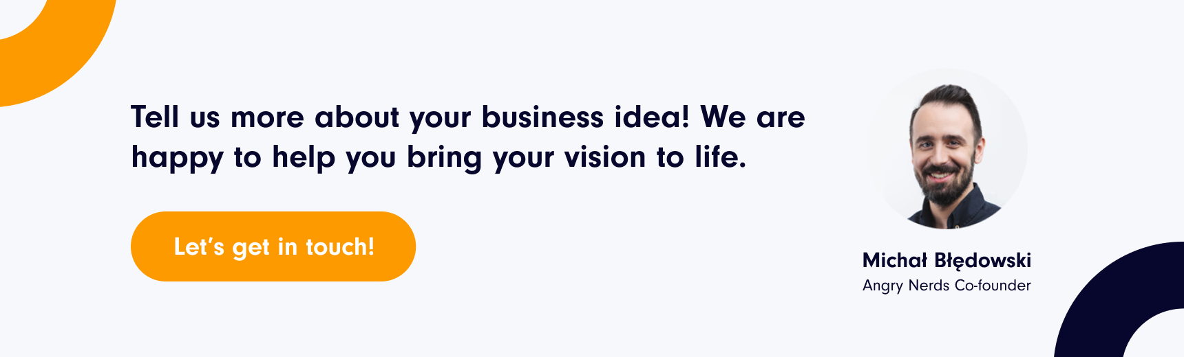 Contact one of our sales specialists at Angry Nerds Software and tell us more about your business idea! We are always happy to help you with a personal approach.
